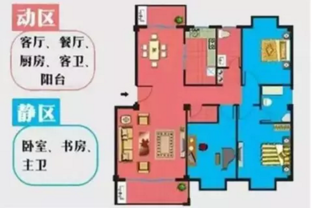 所謂“動靜分離”,就是把動區(qū)(客廳、廚房、餐廳等)跟靜區(qū)(臥室、書房等)通過合理的空間布局給分離開來,在動區(qū)的活動保持的基礎(chǔ)下,又能讓靜區(qū)能夠保持一定的私密性,減少彼此之間的干擾。