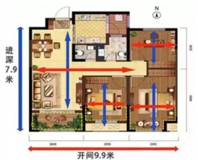 把房子的主要采光面稱為開間(一般指東西的距離),與其垂直的稱為進深(一般指南北的距離)。開間和進深的比例為4:6較為合適,如果開間太小,進深過大,會影響房子的采光,反之則室內(nèi)溫度,濕度不穩(wěn)。