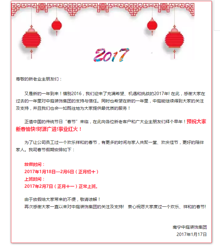 公告|中庭裝飾集團(tuán)春節(jié)放假通知