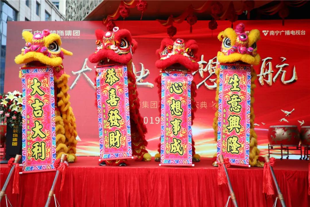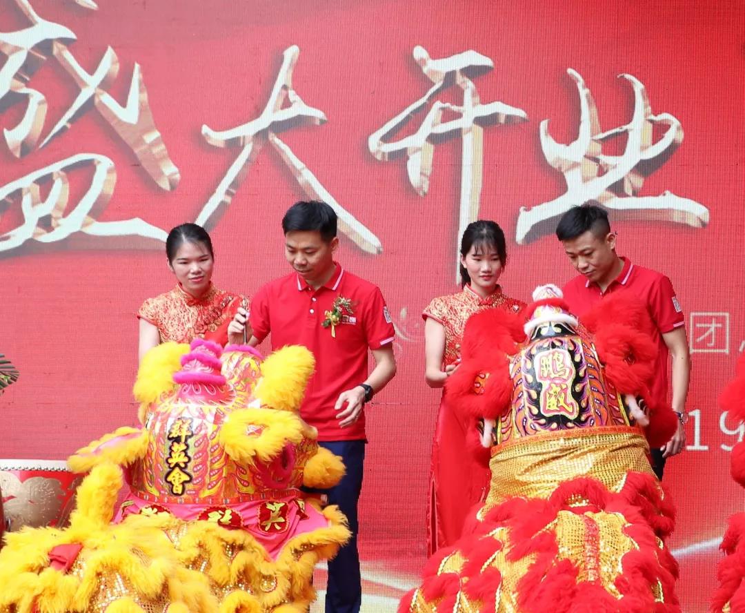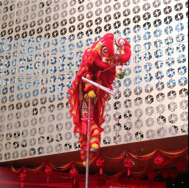 在鏗鏘有力、熱鬧非凡的鑼鼓聲中,火舞祥獅將寓意著“生財”的生菜送到集團總裁丁胡手中,為中庭裝飾集團獻(xiàn)上祥瑞的祝福。
