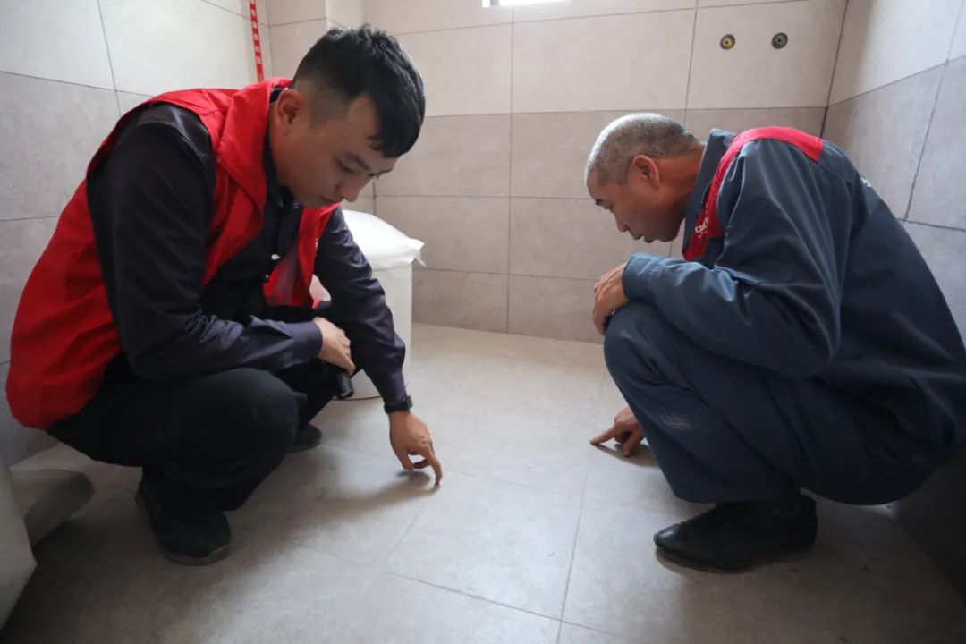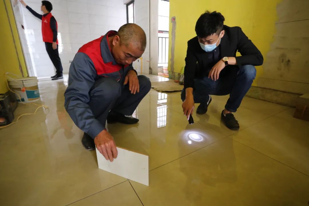 ▲檢查瓷磚鋪設(shè)工藝是否合格