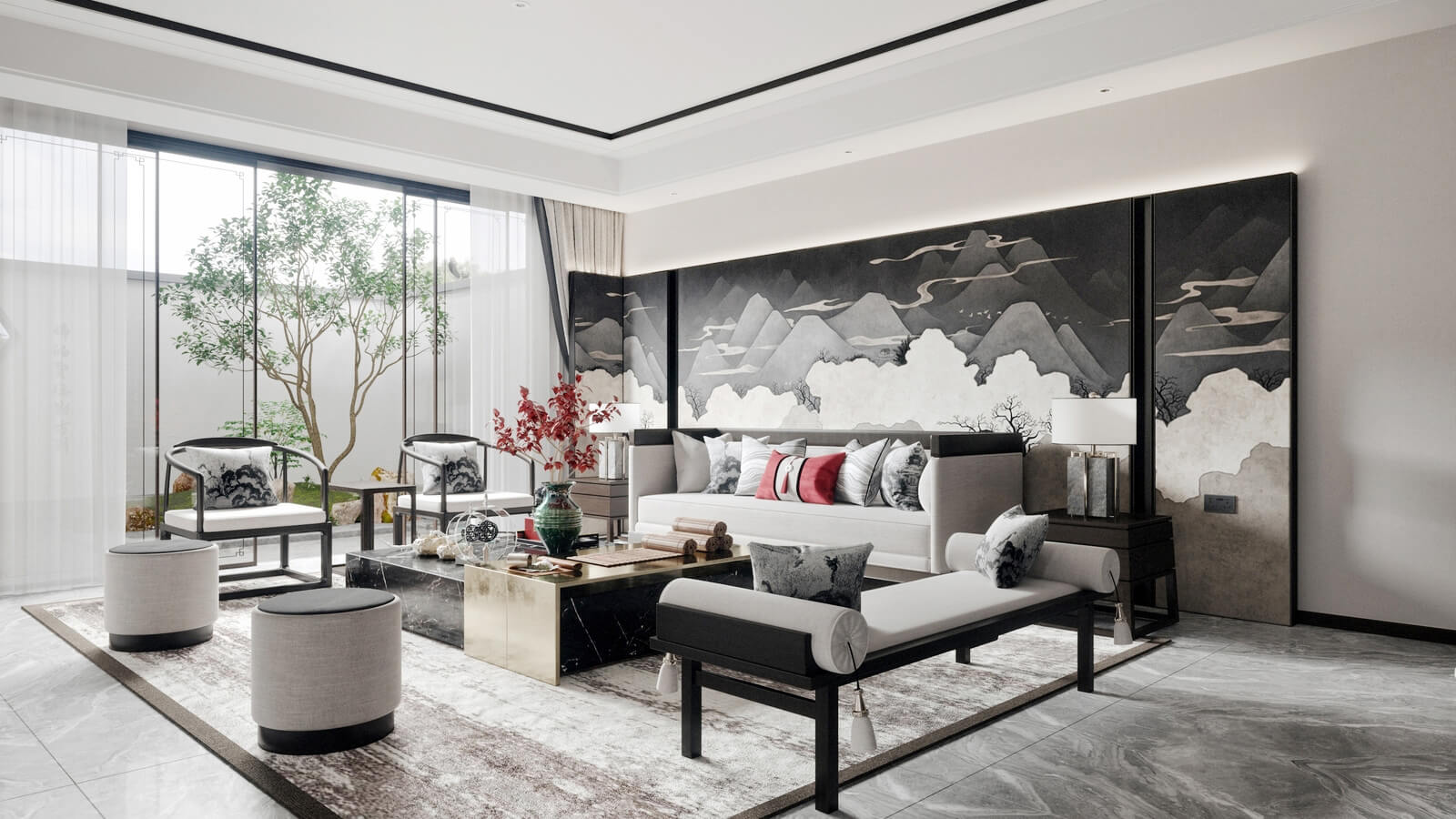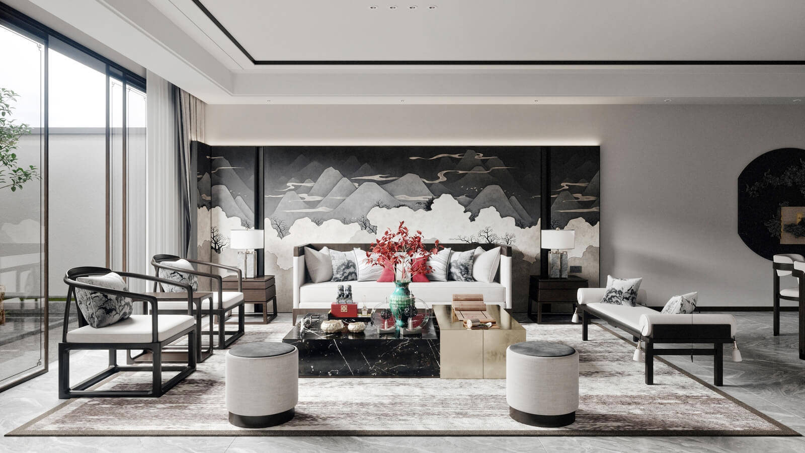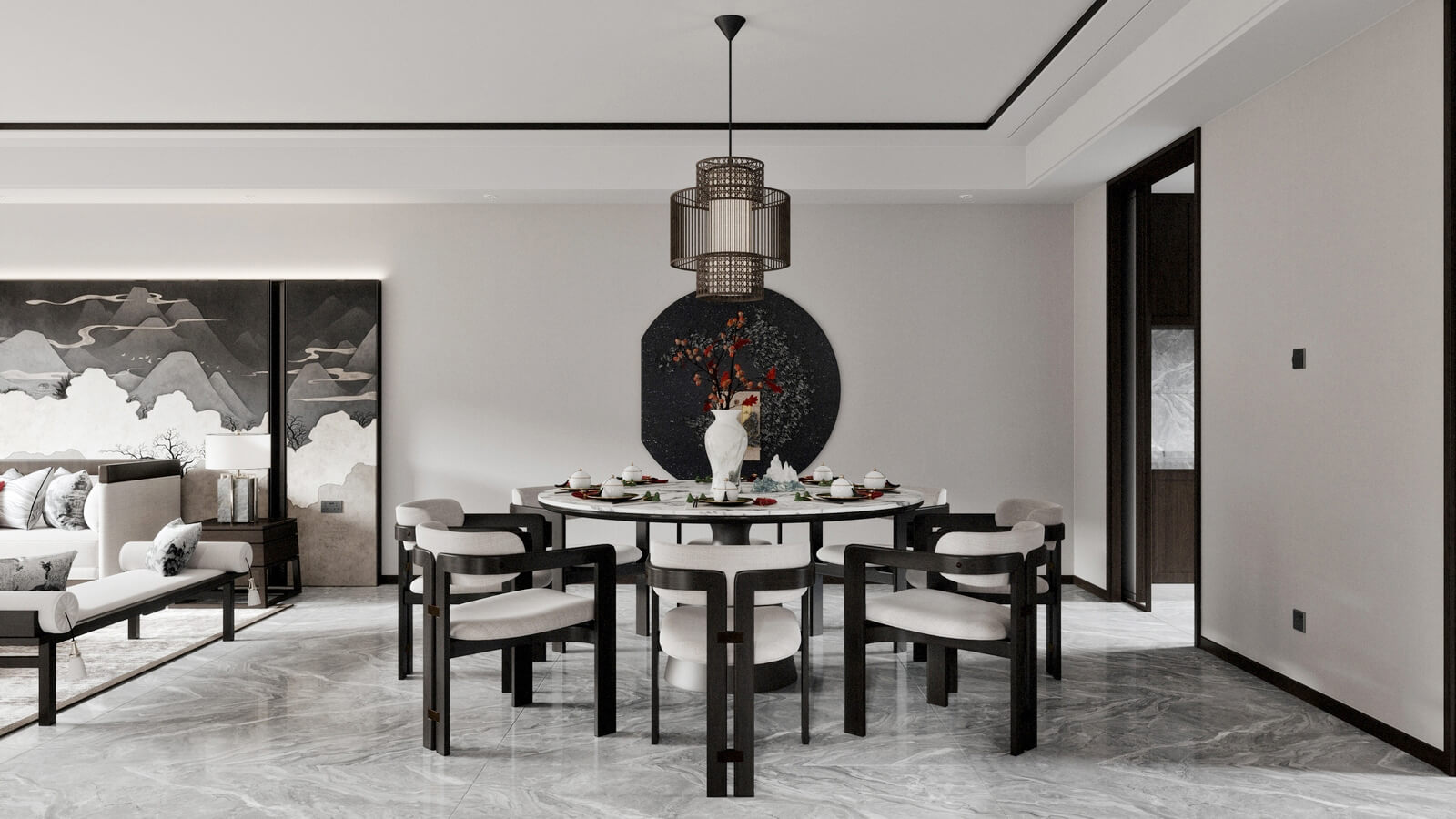 瀏覽量:1139設(shè)計師打破了人們對傳統(tǒng)中式風(fēng)格的固有觀念,加入了許多現(xiàn)代化的設(shè)計元素。其中,中國風(fēng)味一點兒也沒少。山水畫,瓷器,深色桌椅,這些富含古典韻味的裝飾,完美地與現(xiàn)代化的空間融為一體,體現(xiàn)出靜謐的美感。