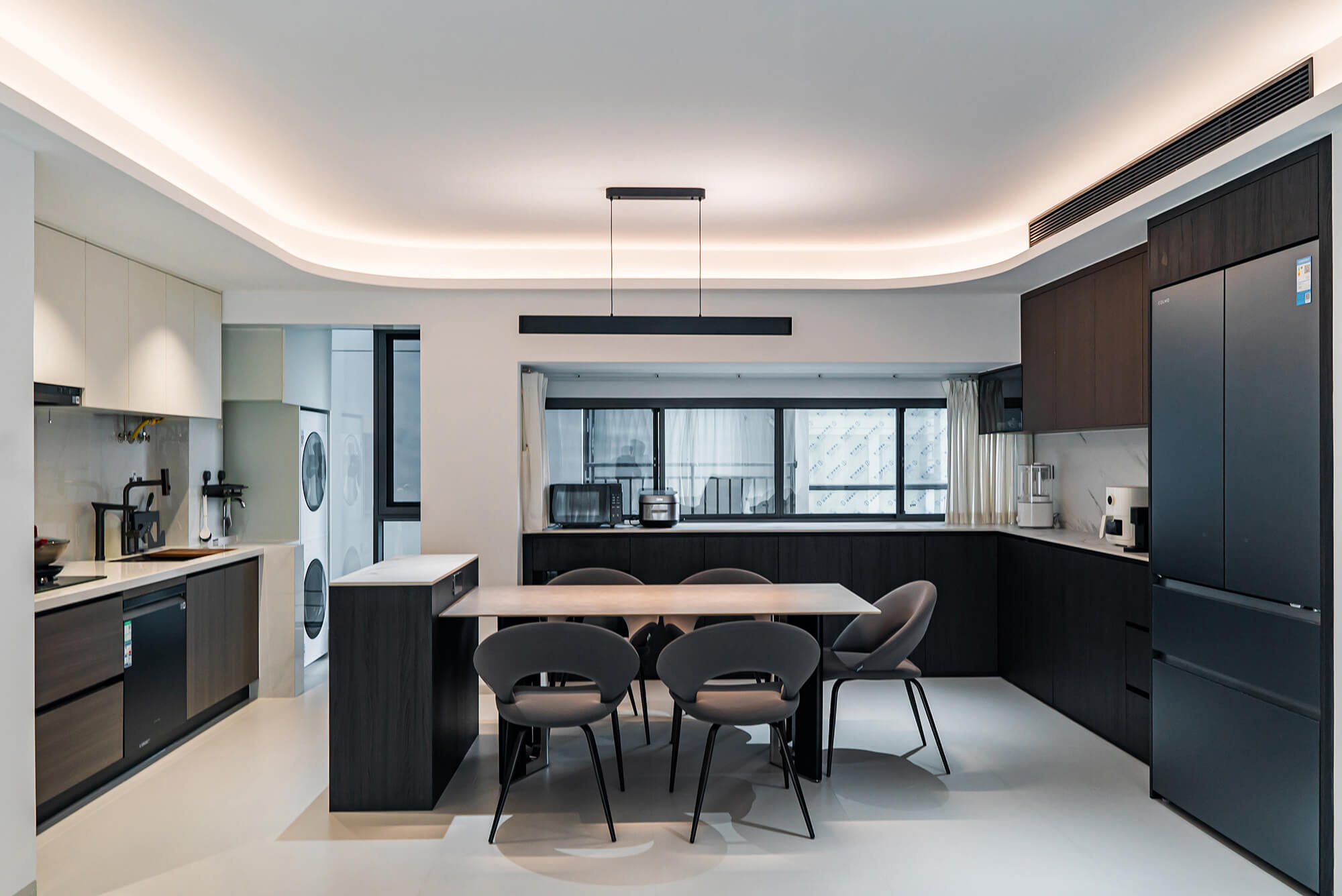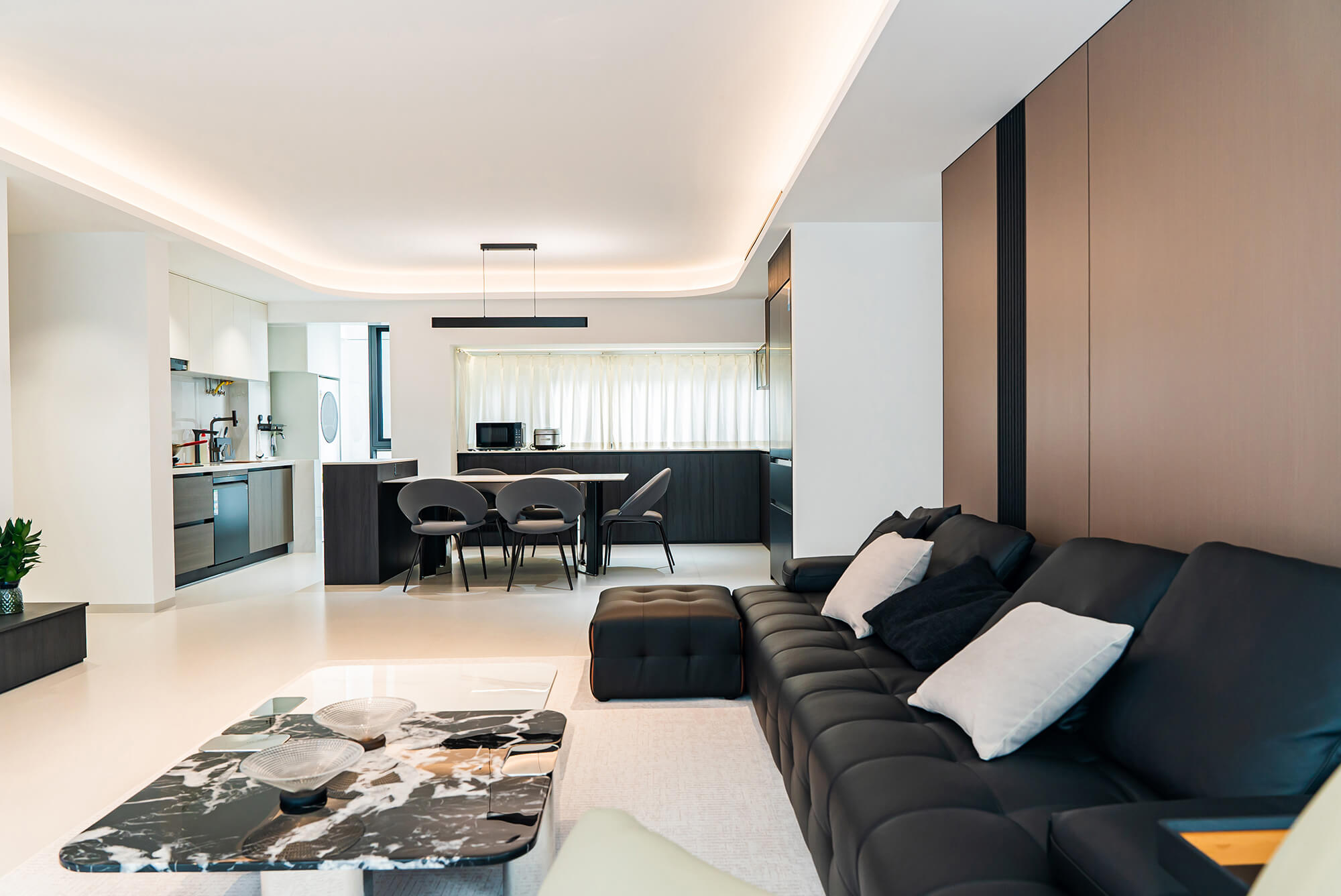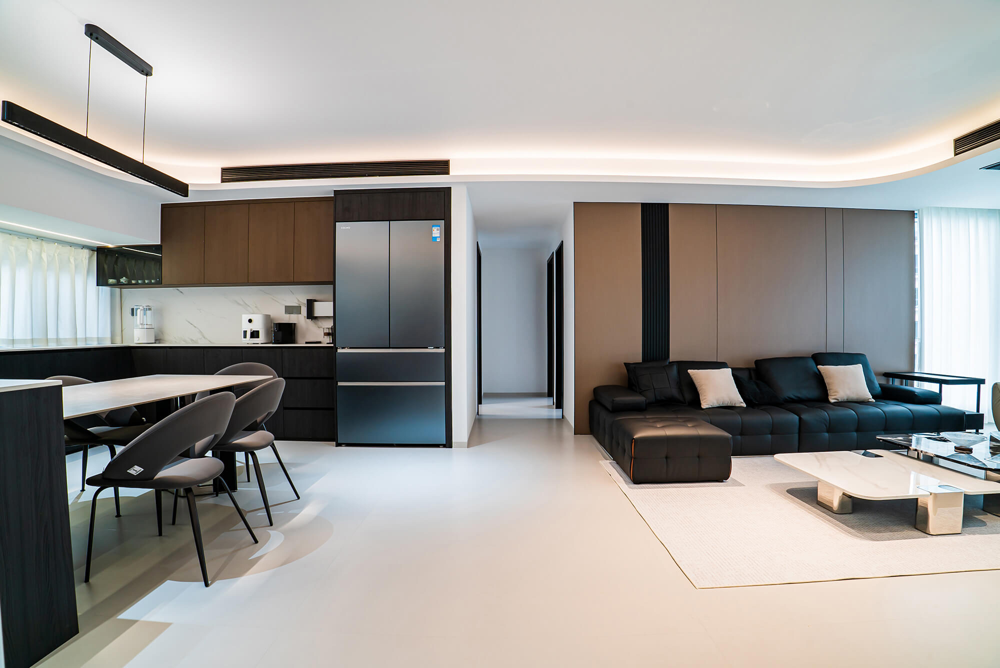 極致純粹的色彩美學,以黑、白、灰三個基礎色構建空間骨架,通過不同明度、材質的層次對比(如啞光水泥、亮面巖板、磨砂金屬)豐富視覺。線條利落干脆,無多余裝飾,注重功能與結構的統(tǒng)一性,打造冷靜、理性、富有高級質感的極簡空間。