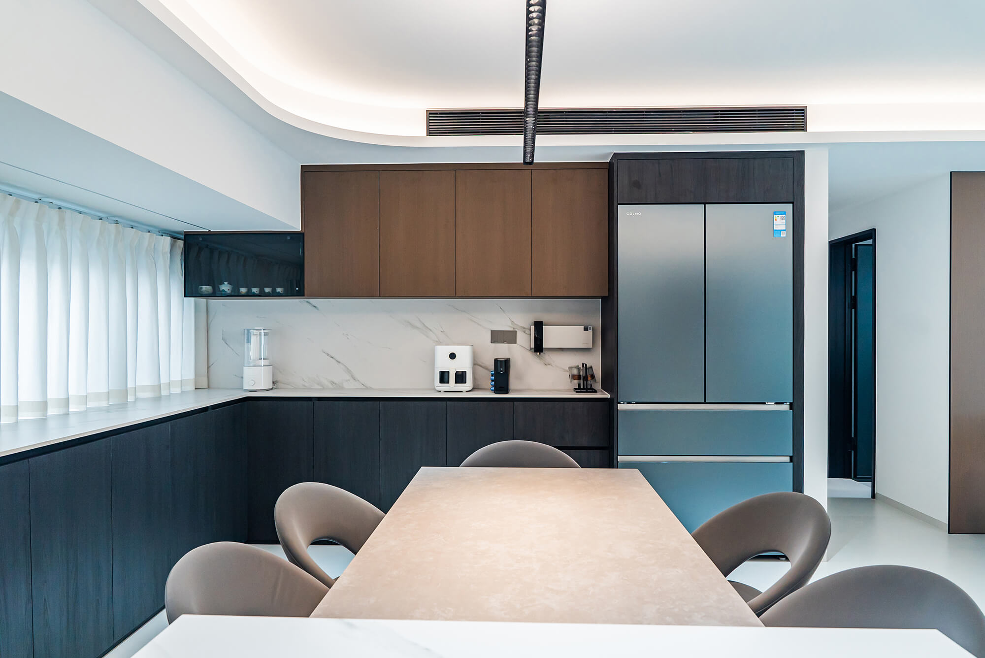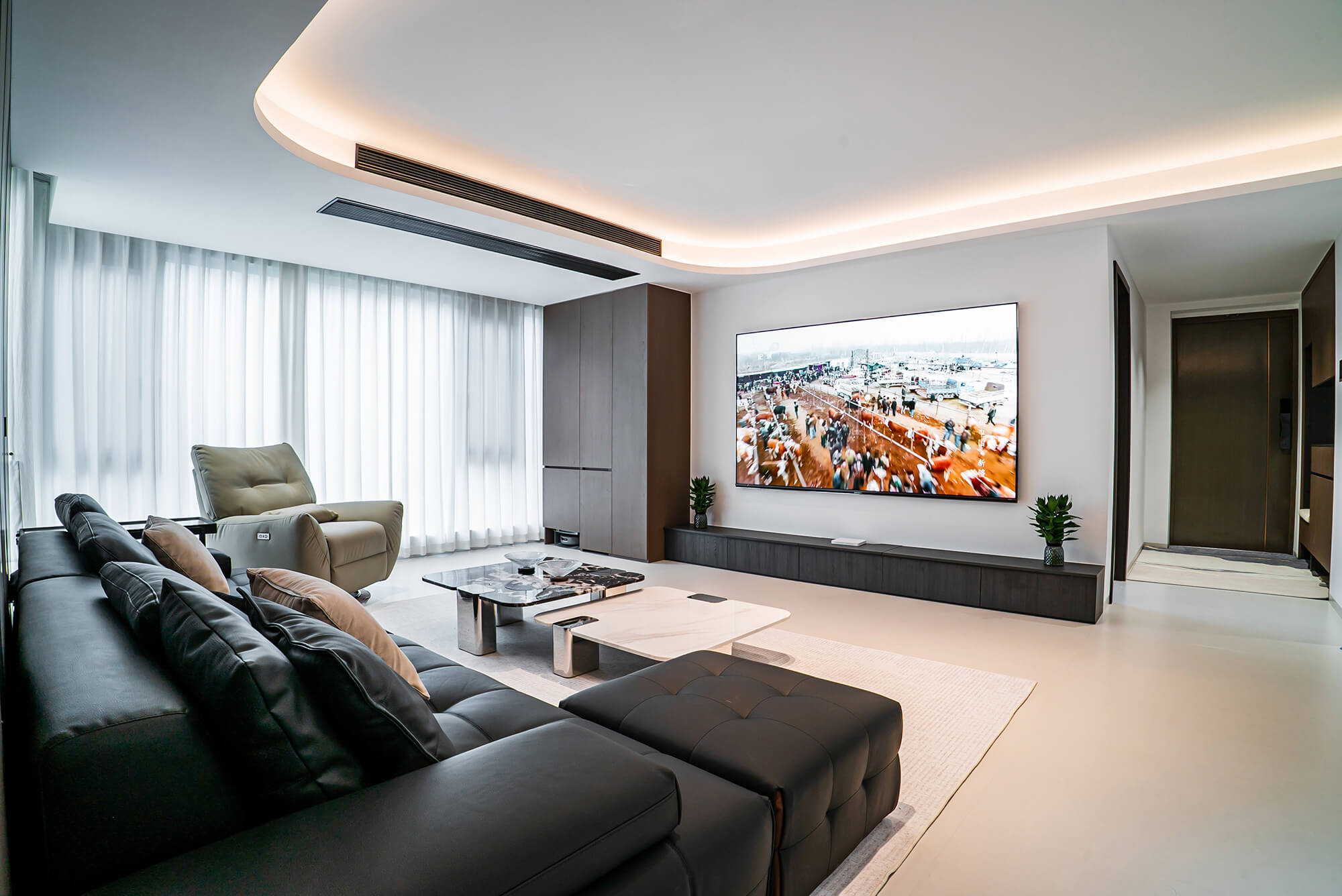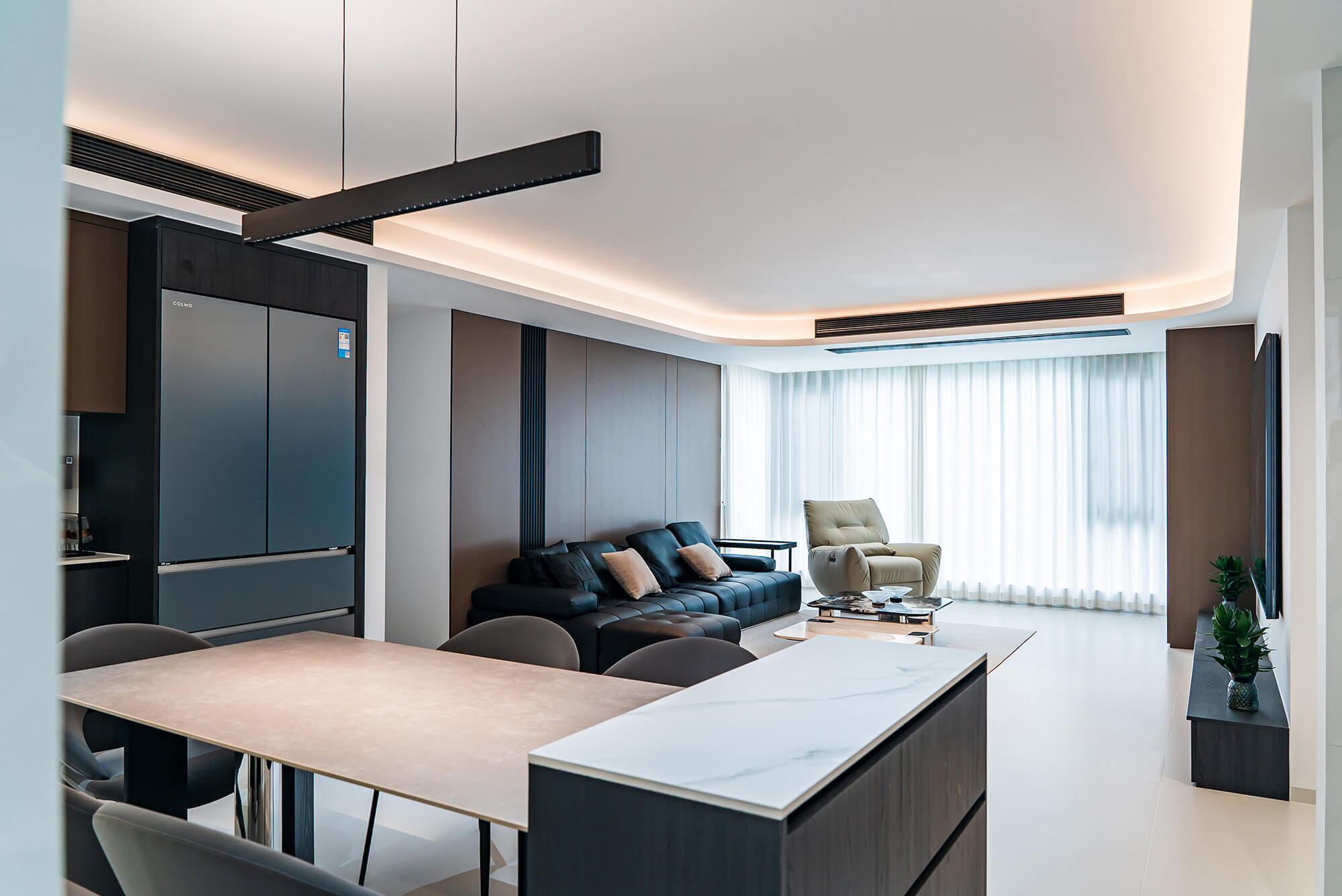 極致純粹的色彩美學,以黑、白、灰三個基礎色構建空間骨架,通過不同明度、材質的層次對比(如啞光水泥、亮面巖板、磨砂金屬)豐富視覺。線條利落干脆,無多余裝飾,注重功能與結構的統(tǒng)一性,打造冷靜、理性、富有高級質感的極簡空間。