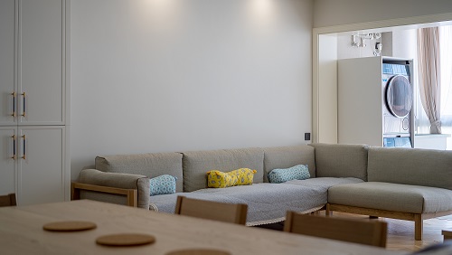 4.客廳:將景觀陽臺(tái)納入客廳空間,視線開闊,到頂?shù)膬?chǔ)物柜滿足收納需求且有足夠的展示空間。